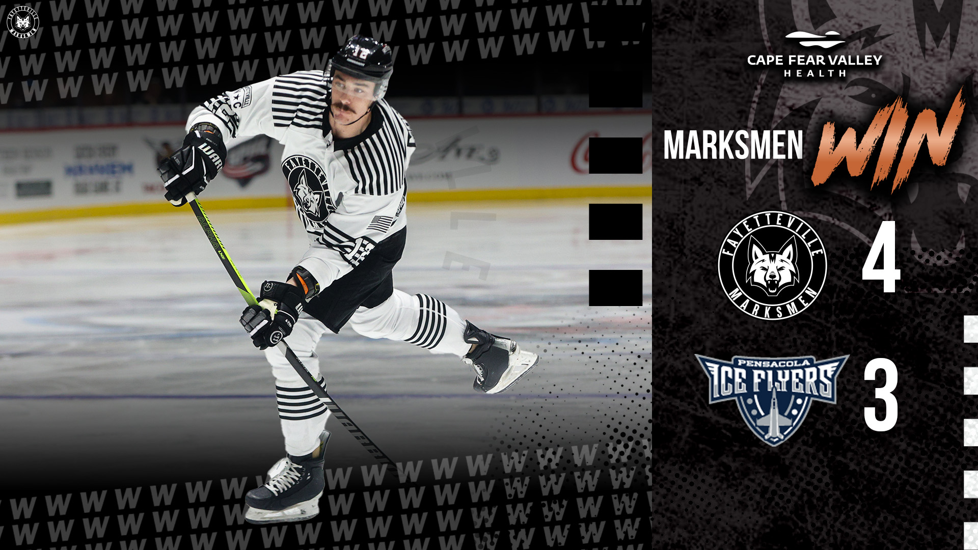The Marksmen and Ice Flyers will finish the weekend with matchups Saturday and Sunday in Pensacola before Fayetteville returns home on the tail end of a home-and-home with Roanoke on Star Wars Night Saturday, January 25.