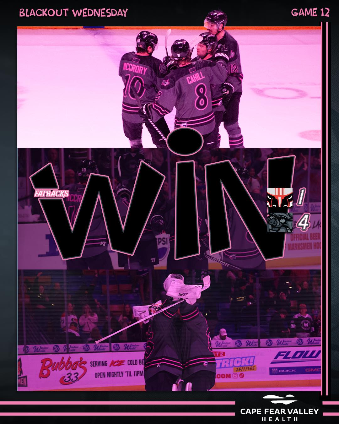 FAYETTEVILLE, N.C. – The Fayetteville Fatbacks, proud members of the SPHL, defeated the Birmingham Bulls 4-1 on Wednesday night.