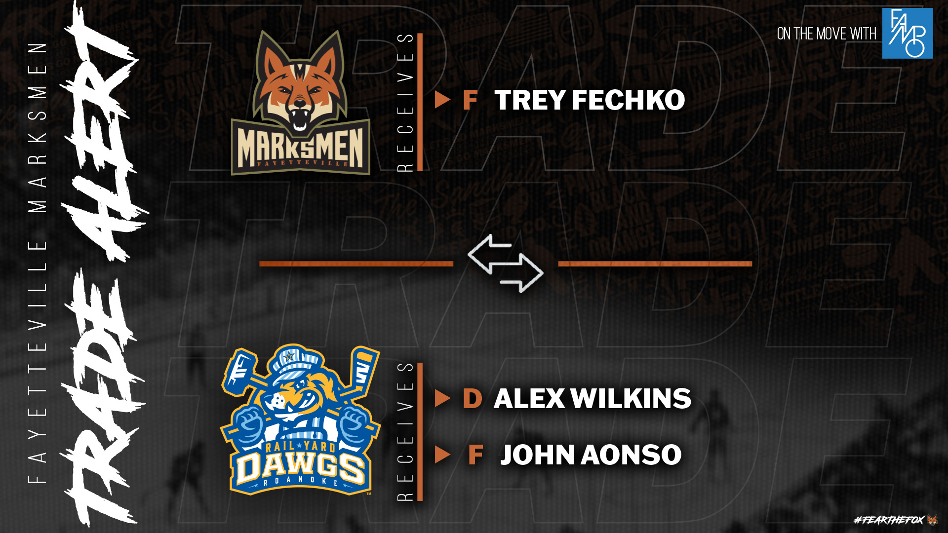FAYETTEVILLE, N.C. – The Fayetteville Marksmen, proud members of the SPHL, announced Monday the acquisition of forward Trey Fechko from the Roanoke Rail Yard Dawgs in exchange for forward John Aonso and defenseman Alex Wilkins.