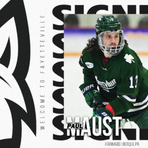 FAYETTEVILLE, N.C. – The Fayetteville Marksmen, proud members of the SPHL, are pleased to announce the signing of forward Paul Maust for the 2025-26 season. Maust, 27, joins the team with 148 NCAA Division-I games of experience with Robert Morris University and Mercyhurst University. He totaled 39 points (19g+20a) and was named an AHCA All-America Scholar. Maust joins defensemen Ryan…